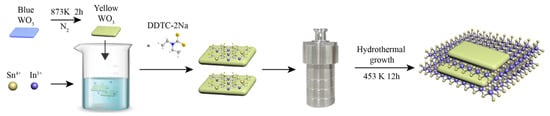 Yellow WO3 nanosheets were synthesized according to a previous report via a solvothermal alcoholysis process followed by calcination of the hierarchical structure of the as-prepared WO3 [27]. Furthermore, a direct WSI S-scheme heterojunction was fabricated by combining the in situ precipitation and hydrothermal synthesis method. In brief, WO3 nanosheets were dispersed in deionized water and ultrasonized for 10 min. Meanwhile, SnCl4·5H2O and InCl3·4H2O were dissolved in aqueous acetic acid solution, and the molar ratio of Sn4+ and In3+ was 1:4. The concentration of the Sn4+/In3+ mixture was 0.3 mM. Then, the above solution was mixed with the WO3 suspension, and 0.24 mM DDTC-2Na was dropwise added to the mixture. The suspension was vigorously stirred for 2 h and then introduced into a 50 mL Teflon-lined autoclave and maintained at 453 K for 12 h. After cooling down to room temperature, the yellow powder was collected by filtration and repeatedly washed by deionized water and ethanol, finally freeze-dried to obtain the WSI heterojunction. Bare WO3 and SIS were also prepared under the same conditions. For the WSI heterojunction, the mass percentage of WO3 to SIS ranged from 1% to 20%. The as-prepared composites were labeled as WSI-1%, WSI-4%, WSI-8%, WSI-12%, and WGS-20%, respectively.