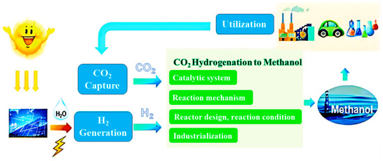 Carbon dioxide is the ultimate oxidation state of carbon-containing compounds, with a characteristically stable molecular structure, and has been traditionally perceived as an inert molecule under typical conditions. This inherent chemical stability has presented challenges in its chemical utilization. Achieving the activation of this inert chemical typically requires elevated temperatures and pressures to surmount the kinetic barriers (C=O bond energy is approximately 750 kJ·mol−1). The introduction of hydrogen (H2) to this landscape has been transformative. Recognized for its high-energy molecular nature and wide-ranging sources in the chemical industry, H2 has emerged as the prime candidate for CO2 activation. This synergy between CO2 and H2 is not merely a serendipitous observation. In fact, it finds resonance in the methanol economy proposed by Nobel laureate George Olah [5,6]. In this vision, CO2 hydrogenation to methanol and its derivatives holds a central role, which bridges the gap between carbon emissions and sustainable fuel alternatives (Figure 1).