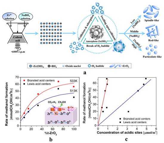 Schematic illustration of the formation mechanism of ZrO2 nanostructures synthesized using different NaBH4 concentrations: nucleation of the Zr(OH)4 precursor, transformation of the Zr(OH)4 nuclei and growth of ZrO2 crystals, and formation of different ZrO2 nanostructures (a). Methanol formation rate as a function of t-ZrO2 content (b). Methanol formation rate at 533 K as a function of the concentration of acidic sites. (■) Lewis acid centers; (●) Brønsted acid centers (c). Reproduced from ref. [35,36] with permission from the American Chemical Society, copyright 2015 and 2014.