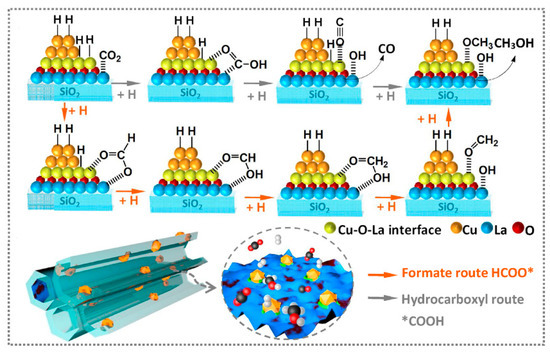 Reaction mechanism for CO2 hydrogenation over Cu1La0.2/SBA-15 catalyst, through a single O atom or along the formate pathway, adsorbed through two O atoms in the bidentate configuration (*HCOO), and further hydrogenated to the final product CH3OH. Reproduced from ref. [50] with permission from Elsevier, copyright 2019.