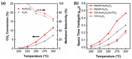 Comparison of the (a) CO2 conversion and methanol selectivity vs. temperature over In2O3 and Au/In2O3 catalysts; (b) STY of methanol and CO vs. temperature over In2O3 and Au/In2O3 catalysts. Reaction conditions: 5 MPa, H2/CO2/N2 = 76:19:5, GHSV = 21,000 cm3/(gcat·h). Reproduced from ref. [56] with permission from the American Chemical Society, copyright 2020.
