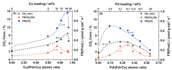 Changes in CO2 conversion and formation rate of products (CH3OH and CO) over Pd–Cu(Y)/SiO2 with fixed Pd loading at 5.7 wt% (A) and Pd(X)–Cu/SiO2 with fixed Cu loading at 10 wt% (B) as functions of Cu/(Pd + Cu) and Pd/(Pd + Cu) atomic ratios, respectively. CO2 hydrogenation: 523 K, 4.1 MPa, 6.2 g-cat h mol−1. Reproduced from ref. [24] with permission from Elsevier, copyright 2020.