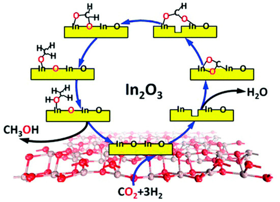 The role of vacancies on the surface of an In2O3 catalyst in CO2 hydrogenation to CH3OH. Reproduced from ref. [66] with permission from the American Chemical Society, copyright 2013.