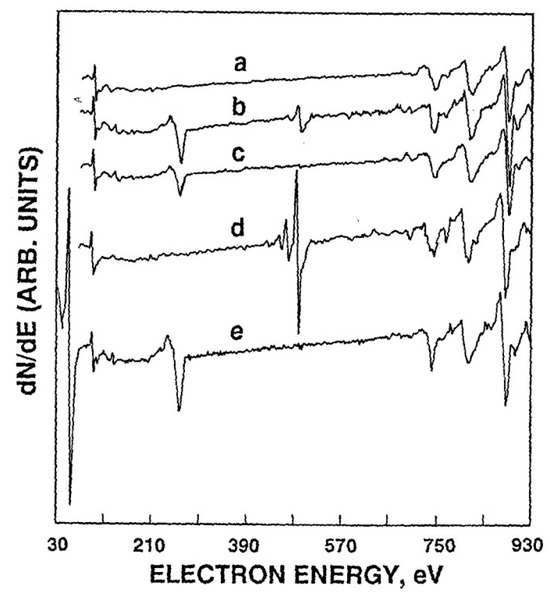 Auger electron spectra of (a) a clean Cu (100) catalyst before reaction; (b) the surface of (a) after a reaction prior to flashing to the reaction temperature under UHV conditions; (c) the surface of (b) flashed to the reaction temperature; (d) oxidized Cu (100) (2 Tort of O2, Tox = 555 K, tox = 5 min); (e) the surface of (d) after reaction and a subsequent flash to 555 K. Reproduced from ref. [97] with permission from the American Chemical Society, copyright 1991.