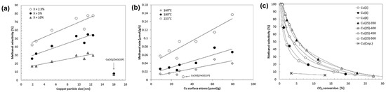 Karelovic and colleagues, by adjusting the calcination temperature and copper content, prepared a series of Cu/ZnO catalysts and evaluated their CO2 hydrogenation performance. They unveiled a mechanism where catalysts with larger copper particles (10–12 nm) had higher methanol selectivity than those with smaller particles (2–3 nm), especially when the CO2 conversion rate was lower [93] (Figure 14). Some researchers believe that even if copper acts solely as an active center, clusters of metallic copper play a role, not individual copper atoms [105]. Similarly, other researchers suggest that highly dispersed metallic copper clusters are the active centers of methanol synthesis. Contrarily, findings by Natesakhawat and colleagues showed that the turnover frequency (TOF) of methanol on small-sized Cu nanoparticles was higher than on larger ones, with no correlation with the lattice strain of the Cu microcrystal, suggesting that this structural feature of copper microcrystals might not be related to their reactivity. Only Cu0 was detected on the catalyst surface both in the reduced state and after the reaction, proving the existence of the active oxidation state of copper [106]. Recent studies indicate that the active sites of industrial methanol catalysts consist of Cu “stacking faults” adorned with Zn atoms, a large number of ZnO defects, and defects in the Cu grains loaded on them [103]. However, this conclusion does not completely fit when explaining the CO2 hydrogenation reaction. Whether Cu+ is an intermediate species during the reduction of CuO to Cu, a result of an interaction between Cu and oxide, or caused by the presence of water is still not conclusive [107].