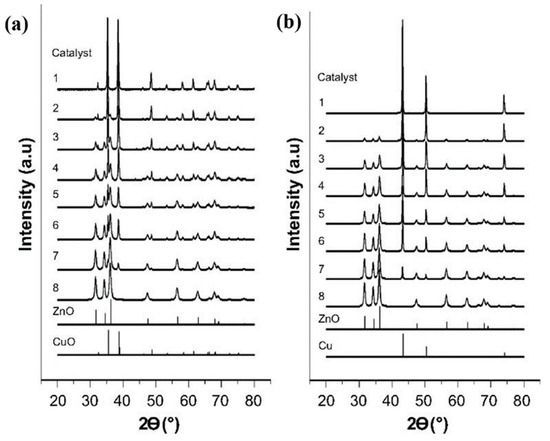 XRD patterns corresponding to (a) fresh catalysts and (b) reduced catalysts. Reproduced from ref. [115] with permission from Elsevier, copyright 2015.