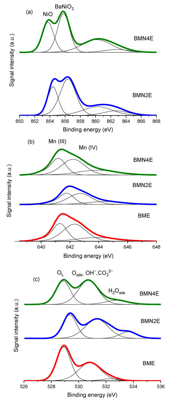 Focusing the attention on Figure 2a, according to the literature [27,28,29,30], binding energy (BE) values between 854 and 856 eV reveal the presence of Ni(II), Ni(III), and Ni (IV) species on the surface, with the existence of Ni(II) supported by the satellite peaks at 860 and 864 eV. So, as it is common on perovskites [26,28,29,30], high oxidation states for Ni (Ni(III) and Ni(IV)) seem to be present on the surface to compensate for the oxidation states of B metal found in BMN2E and BMN4E perovskites. After the deconvolution of the main signal, two components are found, corresponding to (i) Ni from BaNiO3 perovskite (which could be Ni(II), Ni(III), and Ni(IV)) at higher binding energies, and (ii) Ni from NiO at lower binding energies [23].