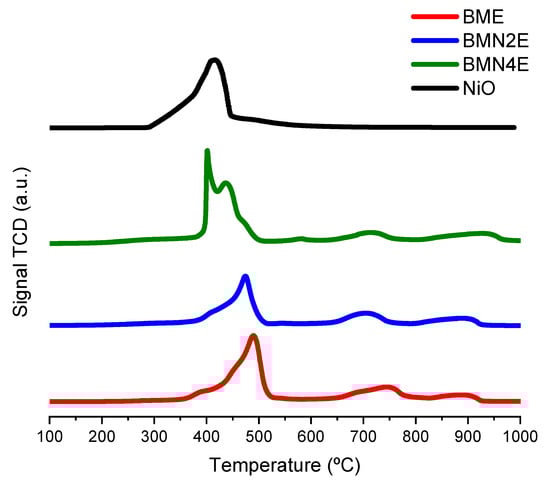 As mentioned above for BMN2E and BMN4E (Figure 3), three reduction peaks are detected [19,21,38]: (i) the first peak corresponds to the reduction of Mn(IV) and Mn(III) to Mn(II), and to the reduction of nickel, as the temperature for the manganese reduction is lower than for the BME sample [23,25]; (ii) the peak at intermediate temperatures, from 700 °C to 800 °C, is due to the reduction of surface oxygen species, and finally, (iii) the peak at high temperatures is assigned to the reduction of Mn(II) to Mn(0). For M5, the first peak appears at lower temperatures than for the BME support due not only to a pronounced synergistic Ni–Mn effect [25,40] but also because this sample presents a higher proportion of NiO (see XPS and XRD results) which is reduced at lower temperatures [39]. The BMN2H sample presents two better defined reduction peaks, suggesting a less pronounced synergistic Mn-Ni effect than M5. Additionally, as the signal intensity is not completely decreased between the two peaks, the existence of a third overlapping peak is suggested. Thus, the reducibility of samples is in accordance with the higher reducibility of nickel from NiO than from BaNiO3.