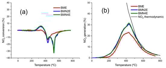 Figure 4b presents the NO2 generation profiles during NOx–TPR experiments. First of all, it must be underlined that the real value of NO2 generated cannot be obtained from these profiles because, as indicated in Figure 4a, a fraction of this NO2 is being adsorbed on the catalyst surface so it is not detected [23]. Thus, these profiles show only the NO2 evolved. Note that all catalysts are active for the oxidation of NO to NO2 at temperatures below ca 400 °C, where the oxidation capacity is higher for the two nickel samples, so nickel should present at active sites for the NO oxidation [23]. However, the NO2 that evolves is similar for BMN2E and BMN4E, featuring a maximum of around 32% at 430 °C.