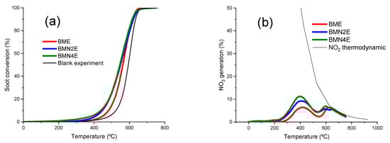 Figure 5a shows the soot conversion profiles of BaMn1−xNixO3 catalysts. At temperatures below 600 °C [21,22], which is the range of temperature relevant for soot removal from diesel engines, all catalysts present conversion values higher than the observed for uncatalyzed reactions (blank in Figure 5a). BMN2E and BMN4E are the most active catalysts for soot removal, and they also evolve a higher amount of NO2 than the raw perovskite (BME) (see Figure 4b). This is because NO2 is more effective than O2 for soot oxidation [19,20,21,22,23], so the catalysts evolving a higher percentage of NO2 should also be the catalysts showing higher soot conversion percentage. Thus, if Figure 5b is compared with Figure 4b (corresponding to the NO2 evolved in the presence and in the absence of soot), it is concluded that around 65% of the NO2 evolved is used for soot oxidation.