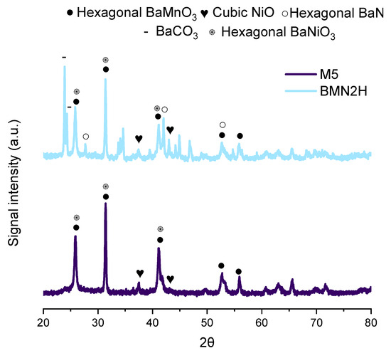 XRD patterns for the two samples are shown in Figure 6. The main crystalline phase is the hexagonal perovskite-type structures. As the angle of the maximum of the BaMnO3 main diffraction peak does not change (Table 5), it seems that, as for the BMN2E sample, nickel is not inserted into the BaMnO3 perovskite framework [23] and it forms the BaNiO3 perovskite. For BMN2H, the BaNiO2.55 perovskite structure is also detected. However, for M5, only the stoichiometric BaNiO3 perovskite structure is formed; so, it is expected that this sample presents a smaller amount of oxygen vacancies than the BMN2H sample. Additionally, the peaks corresponding to cubic NiO are detected for the two samples as a minority crystal phase. In Table 5, the average crystal size data of NiO is included and is higher for M5 than for BMN2H. Finally, BMN2H also shows peaks corresponding to a BaCO3 phase, so this is the most heterogeneous sample. Thus, these results reveal that the nickel addition method is relevant as it determines not only the crystalline phases but also the NiO average crystal size and therefore the amount of nickel active sites, which should be higher for the BMN2H sample.