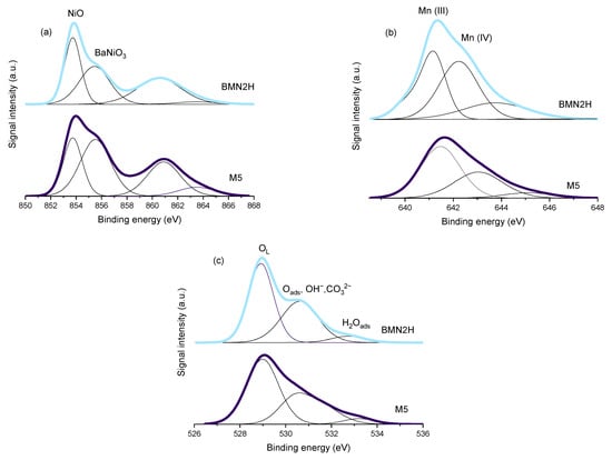 The Ni 2p3/2 (Figure 7a), Mn 2p3/2 (Figure 7b), and O 1s (Figure 7c) XPS spectra of the M5 and BMN2H samples are compared in Figure 7, where the Ni, Mn, and O contributions described for BMN2E (see Figure 3 and related discussion) are also detected [19,21,22,23,25,28,29,30,31,32,33,34,35,36,37].