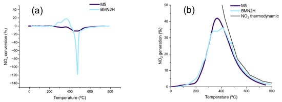 Figure 9. (a) NOX conversion profiles and (b) NO2 generation profiles obtained under TPR conditions for M5 and BMN2H samples.