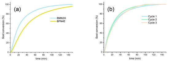Figure 12. (a) Soot conversion profiles at 450 °C for BMN2H and BFN4E samples, and (b) soot conversion profiles in consecutive reaction cycles at 450 °C for BMN2H sample.
