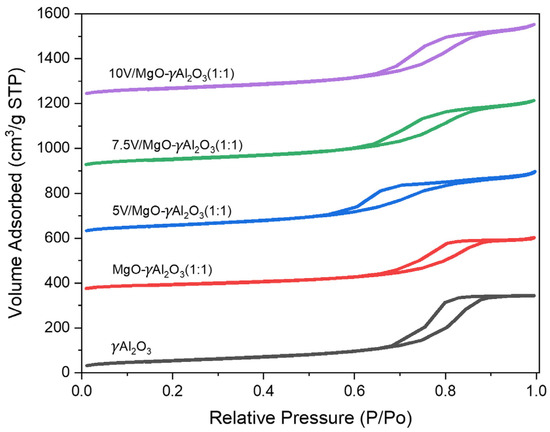 Figure 1 reports N2 adsorption–desorption isotherms for the bare γAl2O3, MgO-γAl2O3, and VOx/MgO-γAl2O3. The obtained isotherms exhibit a Type IV behavior, as classified by the IUPACs [14,31,32]. Hysteresis resulting from capillary condensation was observed at relatively high-pressure ratios, showing the presence of mesopores in the γAl2O3 support structure.