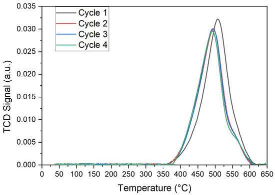 Given the above results, one can conclude that the 5% V/MgO-γAl2O3 catalyst shows the best performance for BODH. Building upon these results, further research was developed to assess catalyst stability for this catalyst loading using consecutive TPR–TPO cycles. Figure 3 reports TPR–TPO for four consecutive cycles.