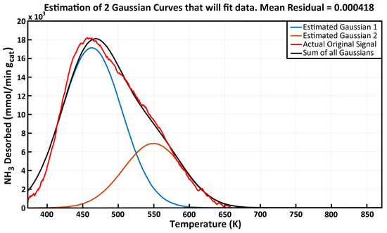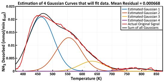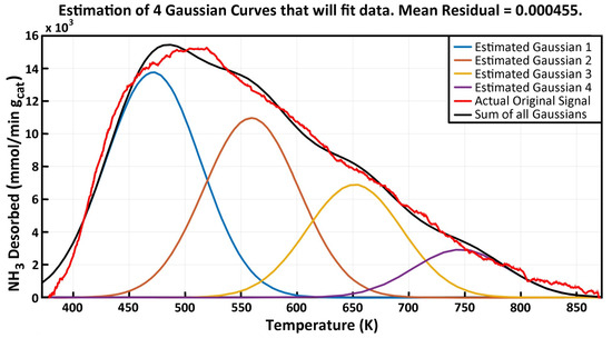 Equation (1) can be used to calculate the desorption kinetics of several sites with different acid strengths. The TPD curve obtained experimentally was fitted to a 4 Gaussian curve representing weak, moderate, strong, and very strong acidities. Figure 5, Figure 6 and Figure 7 show the excellent fit of the ammonia–TPD curves in the proposed ammonia desorption TPD model.