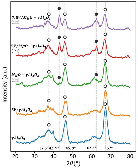 Upon examining the XRD patterns, it was observed that for the catalysts containing 5% V/MgO-γAl2O3 and 7.5% V/MgO-γAl2O3, there were five discernible peaks present at 37.5°, 42.9°, 45.9°, 62.3°, and 67° at the 2θ scale. These peaks corresponded to: (a) γ-alumina at 37.5° (222), 45.9° (400) and 67° (440), and (b) V2O5 at 42.9° (200) and 62.3° (202). No characteristic peaks were observed for MgO.