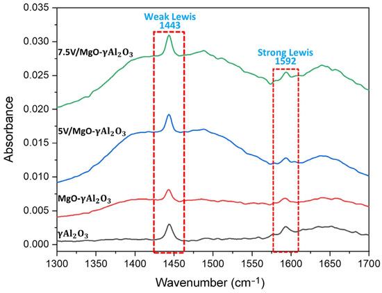 The determination of acid sites in the catalysts was carried out using Fourier Transform Infrared (FTIR) spectroscopy. As a result, adsorbed pyridine molecules were analyzed within the frequency range of 1000–1800 cm−1. This frequency range is commonly used to characterize two acid site types: Bronsted and Lewis acid sites. In Figure 9, the FTIR spectra of various catalysts, namely γAl2O3, MgO-γAl2O3, 5% V/MgO-γAl2O3, and 7.5% V/MgO-γAl2O3, are reported. It can be observed in Figure 9, that all catalysts displayed distinct FTIR bands at 1443 and 1592 cm−1.