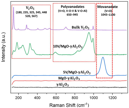 In the case of the 5% V/MgO-γAl2O3 catalyst, narrow peaks were observed at 1080 cm−1 in Figure 10. These peaks corresponded to the stretching mode of the V=O bonds in isolated monovanadate surface species [41,42]. This indicated the possible coexistence of monovanadate and polyvanadate species on the γAl2O3 support [43]. The analysis of the 5% V/MgO-γAl2O3 catalyst indicated, however, the absence of inactive microcrystalline V2O5 phase vibrational bands, typically observed at 993, 703, 527, 483, 476, 405, 305, 285, 198, and 147 cm−1 [44,45]. Thus, this suggested that V2O5 and surface vanadium oxide species all contributed to the catalytic activity in BODH when using the 5% V/MgO-γAl2O3 catalyst.