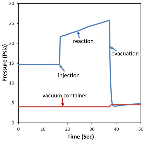Figure 13 illustrates the pressure profiles observed during the BODH runs. The upper curve represents the total pressure, which increased from the injection (pulse) time to the termination time of the reaction. This increase in pressure was attributed to the reaction between butane and the lattice oxygen, which led to an overall increase in the total number of moles. The lower curve in the figure represents the vacuum box pressure during the reaction period, which remained constant. Upon termination of the reaction, there was a sudden decrease in the reactor pressure, while the vacuum box pressure experienced a slight increase. This phenomenon occurred when transferring gaseous products from the reactor to the vacuum box. At this point, further reactions were effectively halted in preparation for subsequent gas chromatography (GC) analysis.