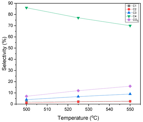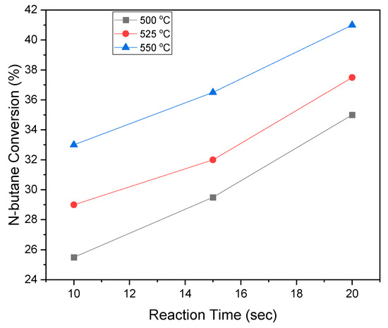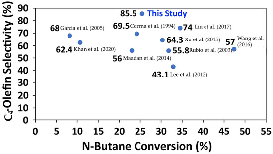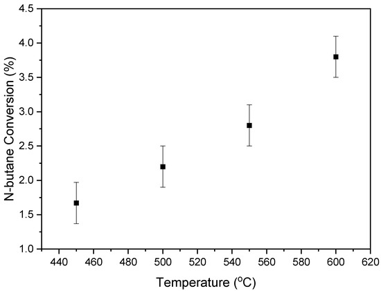 Figure 14 illustrates the findings from these runs, indicating that butane conversion consistently remained at low levels, approximately 4.0%. Based on these results, one could observe that thermal cracking had a minor influence and could be considered negligible in subsequent analyses of the catalytic effects.