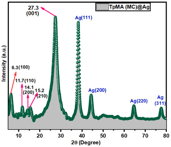 The successful generation of the porous polymeric catalyst TpMA (MC)@Ag) was confirmed by FT-IR spectroscopy (Figure 2). The presence of C=O at 1643 cm−1 confirmed the formation of the aldehyde. The N-H stretching frequency of the primary amine (3464 cm−1) and C=O group (1643 cm−1) of aldehyde vanished in the synthesized porous polymeric framework, indicating that starting materials were completely utilized after porous polymeric framework production. The FT-IR spectra of the freshly prepared porous polymeric framework (porous polymeric catalyst TpMA (MC)) exhibit two bands at 1232 cm−1 and 1523 cm−1, owing to C-N and C=C bonds correspondingly, which indicate the generation of a β-ketoenamine link in the framework. Furthermore, an absorption band appeared at 2923 cm−1 corresponding to C–H asymmetric stretching vibration (Figure S2). It is noteworthy that all abovementioned characteristic bands were also present in the porous polymeric framework TpMA (MC) @Ag, but with slight positional shifts. This observation serves to confirm the attachment of silver nanoparticles within the porous polymeric framework.
