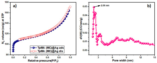 (a) N2 adsorption–desorption curve of porous polymeric catalyst TpMA (MC)@Ag. (b) Corresponding pore size distribution of the catalyst TpMA (MC)@Ag.