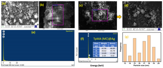 FE-SEM images of the porous polymeric catalyst TpMA (MC) and TpMA (MC)@Ag materials at two different scales (a–d), (e,f) EDAX of porous polymeric catalyst TpMA (MC) and TpMA (MC)@Ag, and (g) particle size distribution plot.