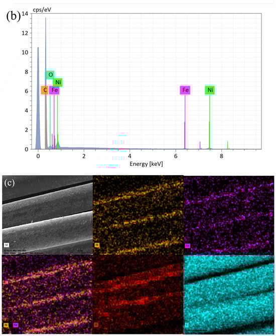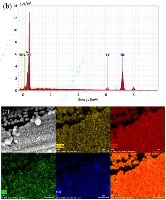 Figure 4 presents the cyclic voltammetry (CV) curves for all examined fibre-based electrodes. The comparison reveals noticeable differences among the samples. Specifically, as expected for the unmodified NiCCF electrode, no cathodic peaks (peaks D and E) corresponding to iron reduction are observed there. Additionally, it could be noticed that the current densities recorded on the NiFe/NiCCF electrode for peaks A and C are significantly higher than those obtained on the NiFe/CF sample. However, in the case of the NiFe/NiCCF sample, peak B is hardly visible. Most importantly, the presence of NiFe alloy significantly reduces overpotentials for the OER and HER processes. Furthermore, the NiFe (at 10 wt.%)/CF electrode exhibits similar OER/HER catalytic properties to those demonstrated by commercially manufactured NiCCF products, with an average Ni content at 45 wt.% (see