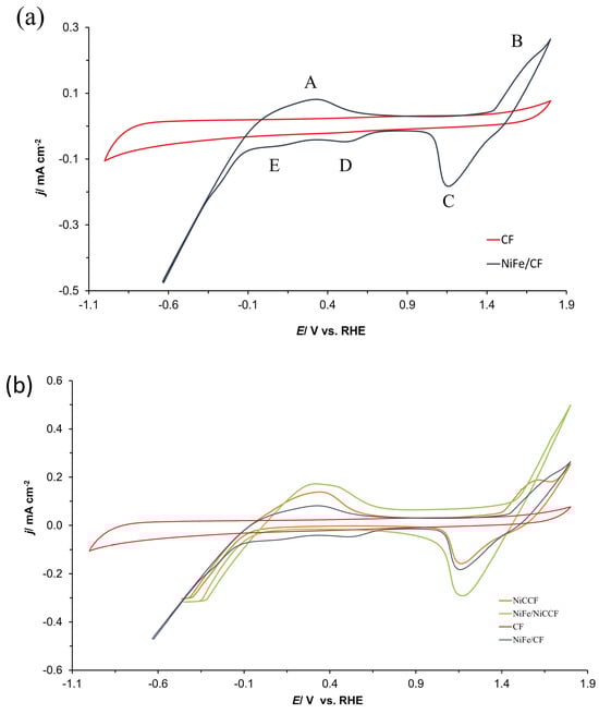 Figure 3a,b. The deposition of NiFe alloy on the surfaces of CF and NiCCF materials resulted in a significant enhancement of the HER and OER catalysis. Additionally, the recorded cyclic voltammograms for the NiFe/CF electrodes exhibited two anodic (A, B) and three cathodic (C, D, E) peaks (see marked peaks in