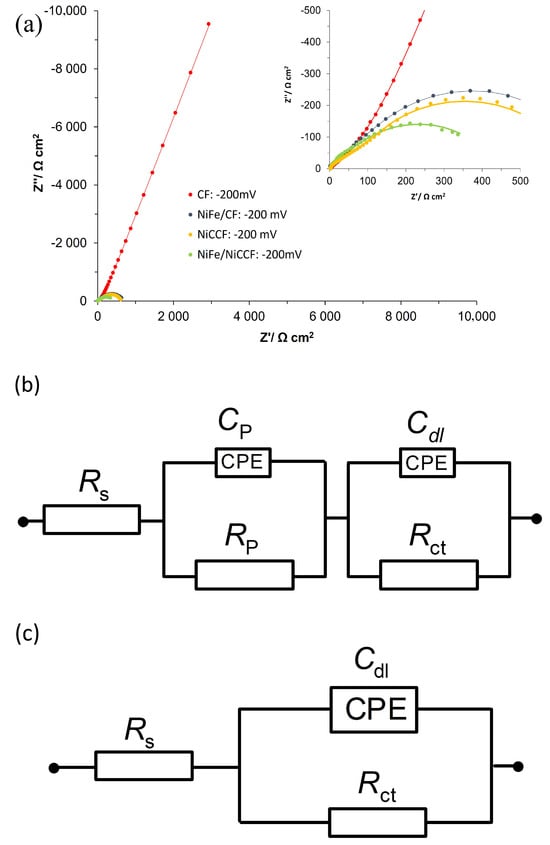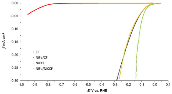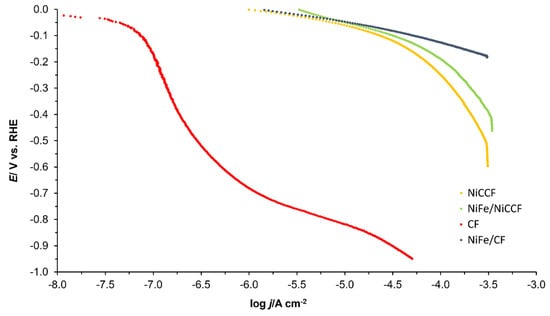 Table 5. The potential range in which these parameters were measured was −50 to −200 mV for the NiFe/CF, NiCCF, and NiFe/NiCCF samples. However, as the onset of hydrogen evolution was observed at much more negative potentials on the CF sample, the potential range −700 to −900 mV/RHE was chosen for this electrode. This phenomenon was also reflected in the EIS results. The values of the Tafel-plot-derived