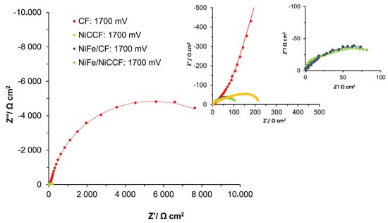 Cdl parameter increased by approximately 13 times at the potential of 1600 mV. Similarly, as for the HER measurements, the catalytic properties of the CF electrodes were significantly enhanced by the presence of NiFe catalyst deposits (
