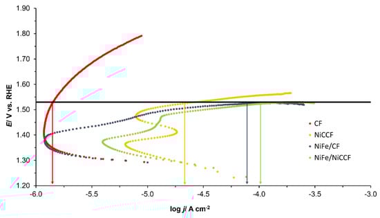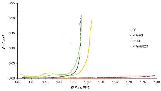 18]. While NiFe-modified CF and NiCCF electrodes did not exhibit as high current densities as certain other catalytic materials, such as IrO