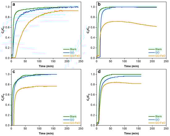 Breakthrough curves of pristine GO and GO–FeO samples used for SO2 capture under various operating conditions: (a) 20 °C and 15 mL/min, (b) 100 °C and 15 mL/min, (c) 60 °C and 10 mL/min, (d) 100 °C and 5 mL/min, with the inlet concentration (C0) at 25 ppm.