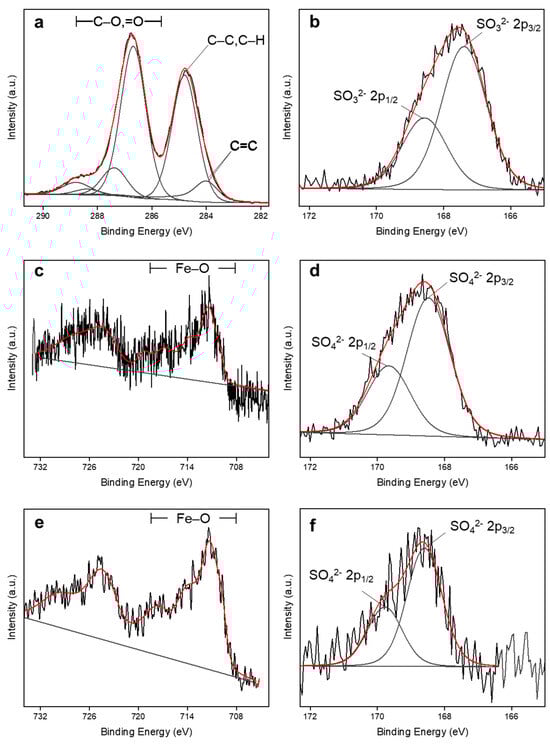 XPS high-resolution spectra: (a) C 1s spectra of pristine GO, (b) S 2p spectra of pristine GO, (c) Fe 2p spectra of GO–FeO, (d) S 2p spectra of GO used for SO2 capture (15 mL/min, 20 °C), (e) Fe 2p spectra of GO–FeO used for SO2 capture (15 mL/min, 20 °C), and (f) S 2p spectra of GO–FeO used for SO2 capture (15 mL/min, 20 °C). The black line indicates the original spectra, while the red curve indicates the resulting curve fitting from the deconvolution.