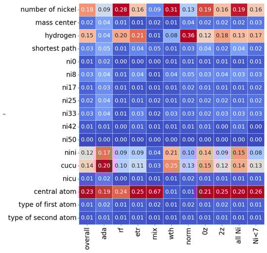 These descriptors, however, exhibit a high correlation with each other, and training the model using all of them would not lead to any improvement in accuracy. Therefore, for further investigations, we decided to select the descriptor that was the most correlated with all the values we wanted to predict: the shortest path on outer Cu atoms. - The composition of the coordination sphere—the atom(s) of the cluster to which the intermediate is bound, consisting of several components: 0%Ni, 8%Ni, 16%Ni, 25%Ni, 33%Ni, 41%Ni, 50%Ni. Each of the described parameters takes the value , where . For example, the value k for parameter 41%Ni means that in a given cluster, it is possible to distinguish k atoms of the metal, in which nickel atoms fill 41% of the first coordination sphere (5 atoms).