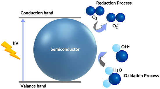 Photocatalysis consists of the direct or indirect absorption by a semiconductor solid of light, visible, or UV photons to destroy contaminants using ultraviolet solar radiation and catalysts to form hydroxyl radicals, which will subsequently have an oxidizing effect on chemical pollutants, as seen in Figure 2. Photocatalysis is an advanced oxidation process that consists of the acceleration of a photoreaction through the presence of a catalyst. It is activated by the absorption of light, accelerating the process. The catalyst interacts with the pollutant through its excited state () or by the appearance of electron–hole pairs, as described by Equation (1) [56].