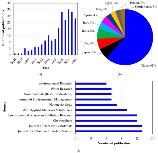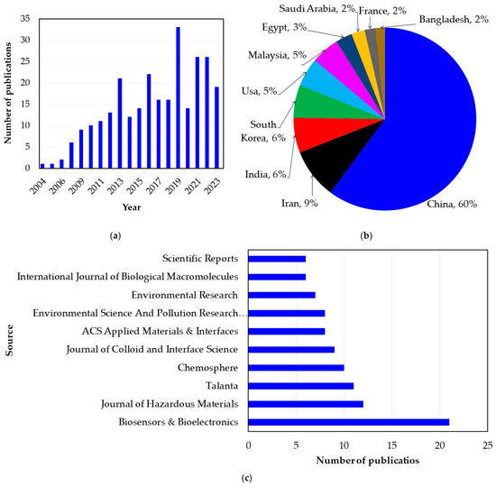 The first PubMed search of the words “(carbon nanotubes or CNT) and (methylene blue)” yielded 227 results related to the topics. Figure 7a shows the number of publications focused on the adsorption or degradation of MB in the last twenty years. This graph presents an increasing tendency of the number of articles over time. Most of these articles come from five countries, and a relationship between parameters and social situations is observed. The countries presented in Figure 7b that have a high scientific production concerning CNTs and MB are China (60%), Iran (9%), India (6%), South Korea (6%), the USA (5%), and Malaysia (7%). Another parameter that helps us to describe the publications and group them is the journals published in these 219 results. Figure 7c presents the ten most frequent sources with three principals: Biosensors & Bioelectronics with 21 articles, Journal of Hazardous Materials with 12 documents, and Talanta with 11 publications.