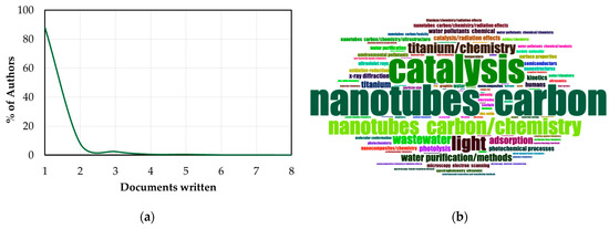 Through author information analysis of the 208 articles obtained, we found that 993 authors are involved. Analyzing these data using Lotka’s law, one author participated in the elaboration of eight works, and another 872 authors only contributed to one, as illustrated in Figure 10a. For the relationship between articles for the search using “(carbon nanotubes or CNT) and (photocatalysis)”, the texts with more relevance were selected. This selection occurred after reading the documents following the inclusion and exclusion criteria, elaborating on the correlation between articles. The inclusion and exclusion criteria allowed us to collect more information and start seeing an association with other areas. The outstanding word analysis functioned by applying bibliometrics to keywords presented in Figure 10b, detecting the trend of research topics related to carbon nanotubes and photocatalysis. From these words, the connection between the principal theme and social issues of current relevance, such as the importance of environmental remediation and water purification methods, could be determined. Among these words, the most relevant are catalysis, nanotubes, carbon, carbon nanotubes/chemistry, and light.