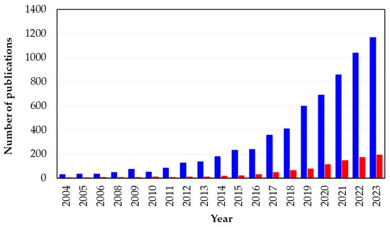 Figure 6 shows the growth of research by the increase in the number of research documents about “Photocatalysis” and “Photocatalysis and visible light” during the last 20 years. The interest in photocatalysis became noticeable in 1972 due to the discovery of photo-assisted electrochemical hydrolysis of water with a monocrystal of TiO2 as a working electrode and a platinum counter electrode under the application of a chemical or electrochemical potential [70]. Studies of carbon nanomaterials such as photocatalysts exhibited CNTs with high photocatalytic activity in the degradation of organic dyes due to their semiconducting nature and the formation of electron–hole pairs, so they are a viable option for this analysis [2,27,71]. Among these carbon nanomaterials are the three-dimensional carbon nanostructures of interest reported, such as graphene oxide and reduced graphene oxide platelets pillared with CNTs [72]. CNTs/catalyst nanocomposites have received a lot of interest due to the inherent properties thanks to the incorporation of CNTs into the composite, such as the enhancement of the photocatalytic activity of metal oxides [73,74].