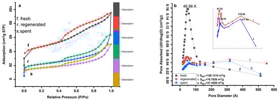 Figure 1 displays N2 adsorption–desorption isotherms of the samples at −195.781 °C and the corresponding Barrett-Joyner-Halenda (BJH) pore size distribution based on the adsorption branch. Figure 2a shows that all the curves of the tested samples have similar features and represent a combination of type I and IV isotherms [,]. The adsorption branch of the curves, which has a type I isotherm, is related to the microporous structures of the catalyst []. The hysteresis loop appears above p/p0 = 0.4, for the fresh catalyst, which can be attributed to IUPAC H4-type, indicating a complex structure with mesopores and micropores [,]. The hysteresis loops for regenerated and spent catalysts above p/p0 = 0.43 can be attributed to the IUPAC H3-type, which at p/p0 > 0.7 indicates the absence of limiting adsorption due to the accumulation of coke over the mesopores of the catalyst [].
