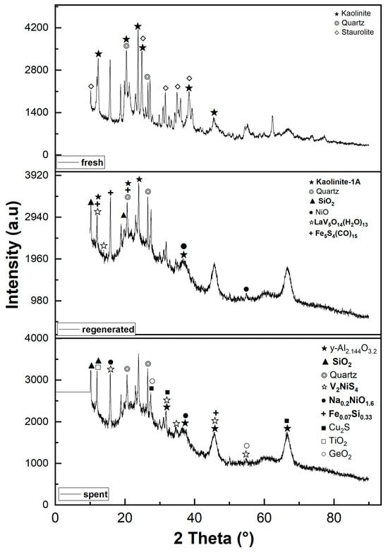 The XRD patterns of all samples are shown in Figure 2. The XRD patterns of the fresh sample were compared with those of the regenerated and spent samples to better understand the evolution of catalyst structure due to thermal conditions during the process.