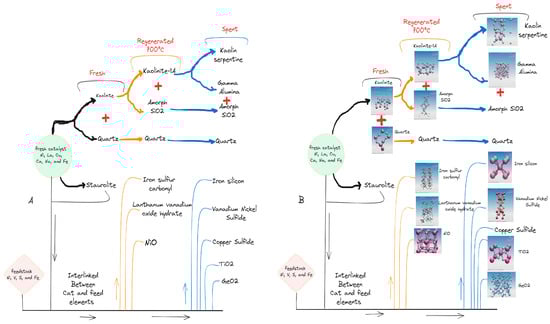 According to the XRD analysis, during the thermal treatment of the catalyst, it was clearly observed that the texture changed due to the intermolecular reaction. This clearly indicates that some components lose their crystallinity and crosslink to form new structures, as shown in Figure 3A,B [,]. Under the same thermal conditions, there were no significant peaks of gamma alumina on the regeneration XRD curve in contrast to the spent catalyst. This occurrence of gamma alumina peaks in the spent catalyst shows that the residence time of the catalyst in the process has an important influence on the kaolinite transformation process. Furthermore, this means that at a constant thermal condition, the linkage and interaction of catalyst components depend on the residence time of the catalyst in the process. The longer the residence time, the deeper the reaction between the components.