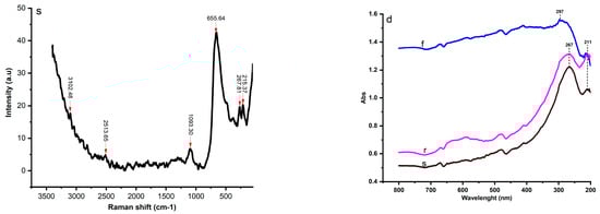 Figure 4 shows the Raman spectra of fresh (f), regenerated (r), and spent (s) catalysts. The fresh catalyst exhibited Raman bands of 339.14, 1363.69, 1594.94, and 2915.96 cm−1, while the regenerated catalyst showed bands of 143.93, 394.55, 508.68, 633.35, 1368.14, 1568.47, 2473.42, and 3104.40 cm−1. The spectra bands of 215.37, 267.81, 655.64, 1093.30, 2513.65, and 3102.48 cm−1 were identified from the spent catalyst.