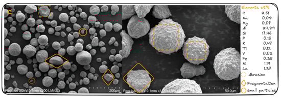 Figure 6c shows the images of the spent catalyst SEM after deactivation with a carbon content of 1.26 wt.% on the catalyst. These images show a complete disappearance of the mesopores, physical abrasion of the particles, and fragmentation into smaller pieces. These phenomena may relate to collisions between particles or particles against the tube [], lateral cracks on the particle surface, and surface attrition due to stresses caused by fluid dynamics [], as well as poisonous metals such as iron, nickel, vanadium, and sulfur, or the reaction between iron and calcium []. The catalyst’s attrition such as catalyst abrasion and fragmentation, is an important factor affecting particle properties [,,,].