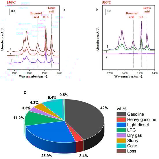 Pyridine adsorbed-FTIR spectra (a,b) [fresh (f), regenerated (r), and spent (s) catalysts] and distribution process’s outlet products (c).