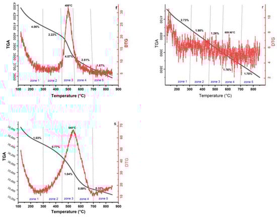Mass loss for each zone: fresh catalyst (f), regenerated catalyst (r), and spent catalyst (s).