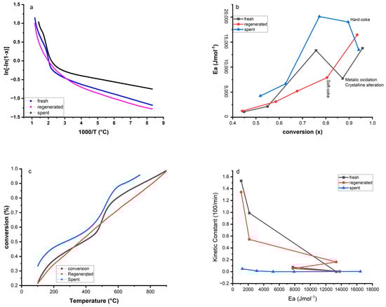 Figure 9b–d shows the five-point zones of all samples on the curves of activation energy and conversion with temperature and kinetic function. It was demonstrated that the activation energies change from each conversion zone. This behavior shows the complexity of the thermal decomposition due to the progressive degradation of the catalyst structure, such as the removal of components like nitrogen, H2O, and other components. It seems that the deeper the catalyst is treated, the more the catalyst loses the hydroxyl bonds (OH) and other degradation products, and the more energy is required []. The variation of activation energies in different zones is sometimes related to the H/C ratio in the sample []. The lower Ea values in zone 1 are generally related to the breaking of hydroxyl bonds, and high energy is not required to break these bonds such as light components. The lower Ea and higher conversion values (0.67) of the regenerated catalyst observed in zone 3 compared to the values of the fresh and spent catalyst may be related to the remaining soft-coke decomposition in this 450–550 °C range. The lower Ea value observed in zone 5 (134.56 × 102 Jmol−1) of the spent catalyst compared to its zone 4 (190.16 × 102 Jmol−1) may relate to the temperature range of 700–850 °C to remove the hard coke in the sample with a significant mass loss (1.78 wt.%) []. As shown in Figure 9b, the maximum apparent activation energies are reached at a conversion of 0.95, 0.93, and 0.77 for the fresh, regenerated, and spent catalysts, respectively. The Arrhenius equation () was used to calculate the kinetic constant of each zone, as shown in Figure 9c. The kinetic curve of the spent catalyst showed little fluctuation at low K values due to the highest Ea values, indicating that the term oxidation rate decreased in the same way as the activation energy function. The regenerated curve also shows that in soft-coke decomposition (450–550 °C), the kinetics automatically increased with decreasing energy, indicating that the kinetic values are strongly dependent on the activation energy values. In this case study, the behavior of the kinetic rate in non-spontaneous endothermic reactions can be explained by the reactions requiring the absorption of energy, an increase in temperature will provide the reactant molecules with more energy. As a result, a larger fraction of the collisions will have enough energy to overcome the activation energy barrier.