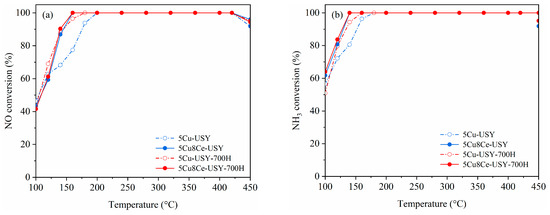 USY zeolites possess the advantages of excellent hydrothermal stability, a super large specific surface area, and a unique super cage structure. Ochońska et al. [17] reported that NO conversion over Cu-USY can exceed 50% at temperatures as low as 100 °C, attributable to the high concentration of Cu+ species with lower binding energy on the Cu-USY surface. Our previous studies regarding NH3-SCR performance over various Cu-zeolites also revealed that Cu-USY shows a wider NO conversion temperature window (from 150 °C to 400 °C) along with good N2 selectivity. It was also reported that introducing Ce into Cu-USY with proper doping content could enhance oxygen mobility as well as increase the active Cu+ sites concentration, thus benefiting low-temperature SCR performance [18,19]. Additionally, the stability of the designed catalysts is quite important for assessing their practical application potential. For the SCR reaction, the exhaust gas of diesel engine vehicles can have temperatures as high as 700 °C and contains a large propotion of water vapor. Zeolite catalysts could easily deactivate due to serious dealumination, zeolite framework collapse, or sintering of active metal under high-temperature, humid working conditions [20]. Improving hydrothermal stability by Ce doping has been well examined in Ce-based mixed oxides such as MnOx–CeO2, but it is still not well interpreted and needs further exploration regarding Ce-doped USY zeolite catalysts.